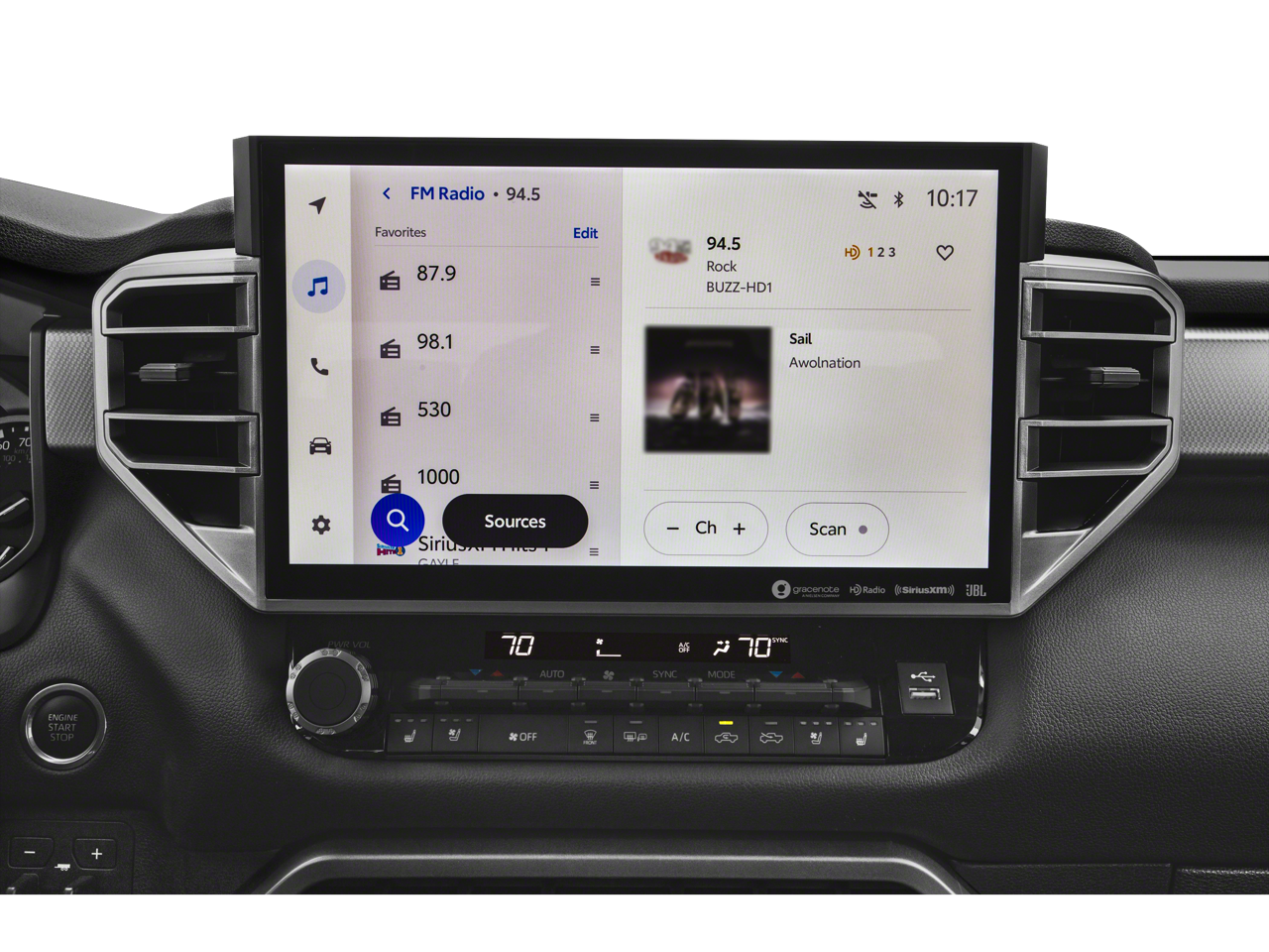 - Radio: AM/FM -inc: 14-inch touchscreen audio multimedia, Android Auto and Apple CarPlay compatible and SiriusXM w/3-month platinum plan trial subscription, See toyota.com/audio-multimedia for details, Connected services - Safety Connect w/up to 10-year trial, remote connect w/1-year trial, drive connect w/1-year trial, service connect w/up to 10-year trial, Wi-Fi connect w/up to 3 GB within 1-month trial, See toyota.com/connected-services for details
